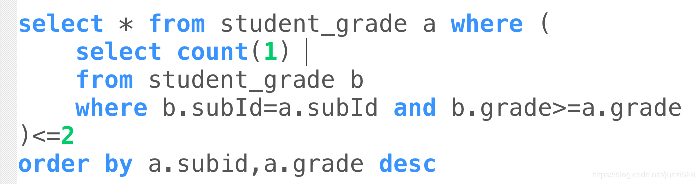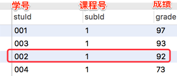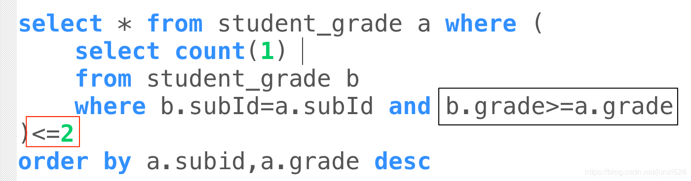 加粗的数据,即从外层a表取出来的。意思是课程1中,有多少个学生的成绩是大于等于97的?97已是最高分了,只有一个。因此满足外层的条件,小于等于2.
