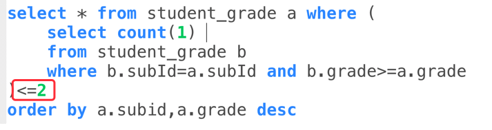 意思是课程1中,有多少个学生的成绩是大于等于93的?结果是2,因为97和93分都大于等于93分。因此满足外层的条件,小于等于2.这样就取出了每门课的前两名。